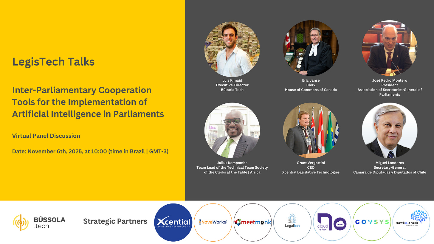 Bússola Tech is proud to host a high-level panel discussion on how inter-parliamentary cooperation can drive the implementation of Artificial Intelligence in legislative institutions. Titled “Inter-Parliamentary Cooperation Tools for the Implementation of Artificial Intelligence in Parliaments,” the session will explore how parliaments and parliamentary networks collaborate to share knowledge, build institutional capacity, and develop responsible frameworks for innovation.